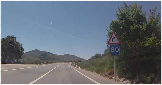 C3 (Figure 3) is located on the regional road A-333, and it is a right curve (geographical coordinates: 37.557542, −4.165947). It has two lanes of 3.5 m width, and shoulders of 1.0 m. The radius is 230 m, and the gradient −2.0%. The average daily traffic is 728, with 4.0% of heavy vehicles. The maximum speed allowed on this road is 90 kph, but just before the curve there is a recommendation of 70 kph.