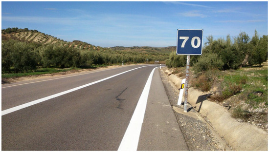 Although an increase in the width of the longitudinal road markings generates a perception of narrowing of the lane, the influence of road lane width in road safety is still under study. For example, Mecheri et al. [32] focused on the effects of lane width for the positioning of drivers within the lane. Their results confirmed that lane-width reduction made drivers stay closer to the road’s center in most traffic situations. Yet in the absence of oncoming traffic, the narrowing gave rise to significant shifts in the distance from the lane’s center to the edgeline. These results may, indirectly, be associated with traffic speed—at low speed (with dense traffic) it is easier to keep the vehicle in the center of the lane than at high speed (with low traffic). Regarding the influence of the lane width in traffic accidents, Casado-Sanz et al. [6] looked into 1064 accidents in the period 2006–2016 in two-lane rural highways in Spain, finding that the occurrence of fatal injury is greater in the wider lanes (45.80% in the lanes over 3.75 m wide, 41.40% in the lanes having a width under 3.25 m, and 32.30% in those of intermediate width).