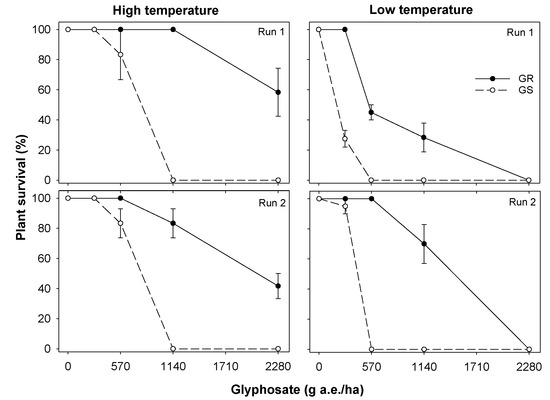 Effect of temperature (high and low) and glyphosate rate on seedling survival of glyphosate-resistant (GR) and glyphosate-susceptible (GS) biotypes of Sonchus oleraceus. The vertical bars are the standard error of means (n = 3). These experiments were conducted in a screenhouse four times (high temperature—Run 1 and 2; low temperature—Run 1 and 2) in 2019/20.