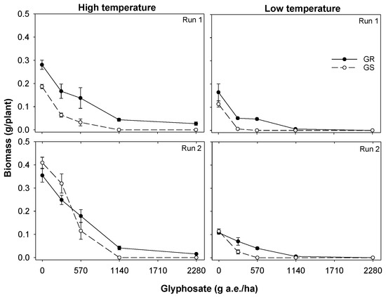 Effect of temperature (high and low) and glyphosate rate on seedling biomass of glyphosate-resistant (GR) and glyphosate-susceptible (GS) biotypes of Sonchus oleraceus. The vertical bars are the standard error of means (n = 3). These experiments were conducted in a screenhouse four times (high temperature—Run 1 and 2; low temperature—Run 1 and 2) in 2019/20.