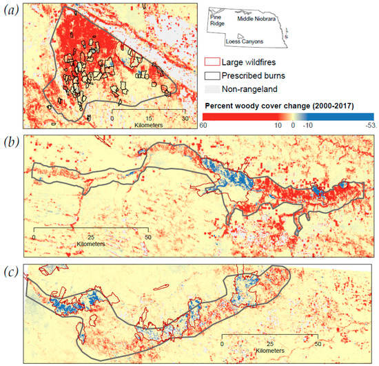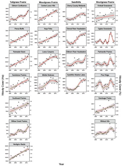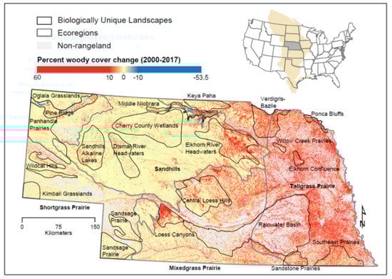 - Donovan, V.M.; Burnett, J.L.; Bielski, C.H.; Birgé, H.E.; Bevans, R.; Twidwell, D.; Allen, C.R. Social-ecological landscape patterns predict woody encroachment from native tree plantings in a temperate grassland. Ecol. Evol. 2018, 8, 9624–9632. [Google Scholar] [CrossRef]