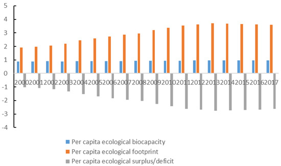 By calculating the per capita ecological biocapacity and per capita ecological footprint separately, we obtain the ecological balance nationwide in 2000–2017, as shown in Figure 2: