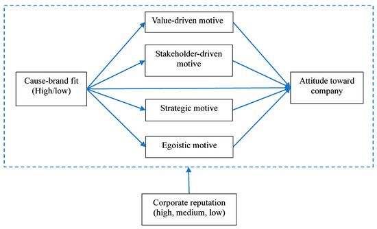Corporate reputation is the result of all the perceptions that individuals have of a company [41]. Fombrun (1996) [79] (p. 72) defined it as the “perceptual representation of a company’s past actions and future prospects that describe the firm’s overall appeal to all of its key constituent when compared with other leading rivals”. Many studies have expressed the ability of CRM activities to increase corporate reputation [15]. Looking closer, reputation is also one of the most important elements of persuasive messages and plays a key role in influencing consumer-attributed motives and attitudes [41]. More specifically, Elving (2013) [41] found that cause–brand fit can have positive, negative, or nonsignificant effects on consumer purchase intentions when mediating company reputation. With regard to consumer attitudes, the study found that a cause–brand fit strategy alters an individual’s reaction to a company from negative to positive but does not affect an individual’s attitude if the corporate reputation is good. When consumers are faced with CRM communications, their prior knowledge about the company plays an important role in affecting their perception of the new campaign/activity, subsequent evaluation, and even behavior [40]. Thus, corporate reputation would function as a moderator to affect the effect of cause–brand fit on consumer-attributed motives and attitudes toward a company. We proposed the following hypothesis: