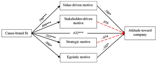 We used covariance-based structural equation modeling (SEM) in AMOS to test the causal paths between cause–brand fit, attributed motives, and consumer attitudes. The results showed that the overall fit of the model was good (χ2/df = 4.706, CFI = 0.961, TLI = 0.953, RFI = 0.941, NFI = 0.951, and RMSEA = 0.075). In the overall model (Figure 2), there was a significant direct pathway between cause–brand fit and consumer attitudes toward the company (Std. β = 0.632, p < 0.001), thus supporting hypothesis H1. In addition, cause–brand fit also impacted consumer attitudes through the attributed company’s motivation. The cause–brand fit had significant effects across all the four dimensions of motivation, particularly value-driven motives (Std. β = 0.798, p < 0.001), stakeholder-driven motives (Std. β = 0.699, p < 0.001), strategic motives (Std. β = 0.323, p < 0.001), and egoistic motives (Std. β = 0.090, p < 0.05). These results supported H2 but refuted H3. Furthermore, value-driven motives had a significant positive effect on consumer attitudes (Std. β = 0.180, p < 0.001), while egoistic motives had a significant negative effect (Std. β = −0.102, p < 0.05) on consumer attitudes. Stakeholder-driven motives (Std. β = 0.076, p > 0.05) and strategic motives (Std. β = −0.074, p > 0.05) did not significantly influence consumer attitudes. Thus, H4 and H5 were partially supported.