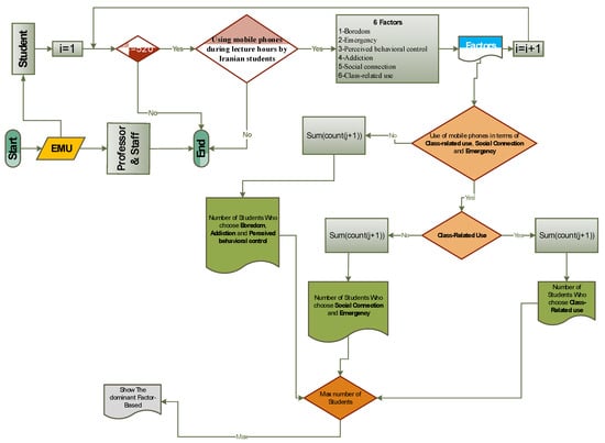 In this part of the study, we provide a brief schematic highlight of the evaluation procedure according to the six principal factors which are based on the Eastern Mediterranean University (EMU) participants to evaluate the importance of each factor. This phenomenon is schematically illustrated in Figure 1. As shown in Figure 1, the group of participants answered a comprehensive evaluation questionnaire regarding six crucial factors about their use of mobile phones during lecture hours. Results showed that class-related use was considered as the most important factor by the students. After that, emergency and social connection were on the second stage, according to the student’s responses. Furthermore, students demonstrated that extra uses of mobile phones during lecture hours might have a possible negative impact on every aspect of classroom assignment and meaningful learning. These factors entail boredom, addiction, and perceived behavioral control which should be considered as debatable phenomena. Therefore, a significant and holistic solution should be taken into consideration to reduce the use of mobile phones during lecture hours and subsequently enhance the quality of mobile phones’ utilization in other circumstances to avoid unnecessary distractions and confusion in the classroom, which possibly reduces the student’s concentration.