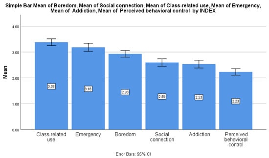 According to the analytical evaluations from Figure 2, which is derived from SPSS software to compare the significant influence of six principal factors which are being addressed in this investigation to the student’s tendency for using mobile phones during lecture hours, it can be seen that class-related use factor has specified the maximum average number of students who have indicated this phenomenon as their priority of using mobile phones during lecture hours. It is approximately 3.5 of the mean factor, which is relatively 1.5 times of the minimum number of student’s tendency to using mobile phones which is related to perceived behavioral control. Since then, students proposed that the emergency and boredom factors are the second largest percentage of the mean factor in response to the use of mobile phones during lecture hours; in this respect, both of these factors experienced an approximate pattern mean factor of 3.