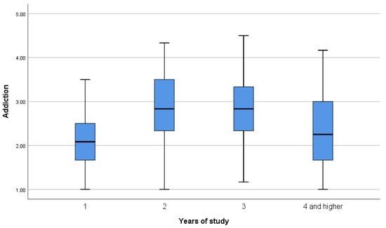 In this part of the study, by the utilization of homogenous subsets test, those groups that had close mean values were put in one section in which the mean value was presented ascendingly. Therefore, according to the results of Table 9, it was shown that regarding the mean comparison and their sequences, the first-year group had the least addiction mean value of 2.14, and the second-year group had the maximum addiction mean value of 2.85. On the other hand, in the second report of Table 9, the profound meaningful concept of the addiction mean value should be generated as the homogenous groups. In this table, each homogenous group has consisted of one column in which two homogenous groups were created. The first homogenous group has consisted of the first- and fourth-year groups. Additionally, the second homogenous group was included in the second- and third-year group. The creation of these groups indicated that first- and fourth-year groups had no difference in addiction mean value. However, there is an essential difference between this group with second- and third-year group. Hence, two different groups regarding the addiction mean value were generated. As can be seen in Table 9, to distinguish the primary placement of fourth-year group in the homogenous section, as it had a similar variance in both subsets, we assume fourth-year group students in both subsets of the mean value calculations. Therefore, due to the negligible impact of the fourth group in the analysis process, we assume the other three groups as the pairwise comparison to determine the existence or non-existence of significant correlations.