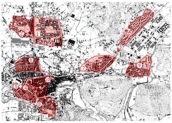 Increasing the number of indicators obviously improves the accuracy of the study and great attention was attached to their SMART characteristics. Within the HEI approach, however, one more advance is represented by the quality of the analysed districts. Areas 1 to 9 in Figure 1 and Table 7 were developed between the 1920s and 1990s, under different planning criteria and visions of the city, but under the same need to provide the 1900s’ expanding population with housing and basic services (schools, churches, etc.). Much different is the city center (Area 10 in Figure 1 and Table 7), which has always been a pedestrian area since it was developed in 1149 as a papal seat. The quality of the built environment is high with narrow alleys, squares and landmarks such as the medieval walls and cultural heritage buildings (with an enforced Limited Traffic Zone—LTZ helping to preserve all of that). Usually, historic centers are not included in the walkability analysis since, by definition, they are fully walkable. In this case, contemplating the city center in the HEI analysis makes it possible to introduce an unusual but significant term of comparison (a reference) among the more modern districts. Moreover, it introduces the research question about the assumed attractiveness of historic areas as a catalyst to attract pedestrians.