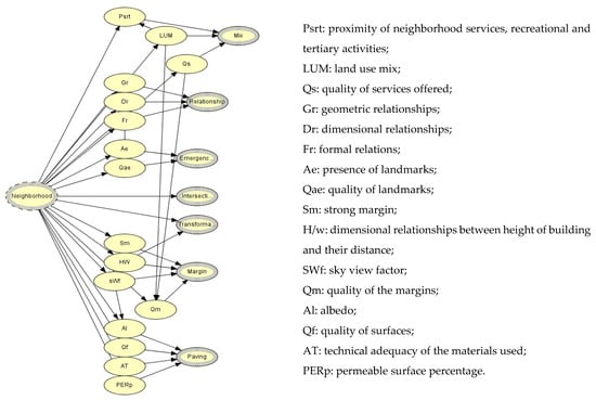 Figure 7 shows the final BNet model resulting from the integration of the output nodes of the seven networks (Level 2—top) with the network generated by experts (Level 3—bottom). The relations occurring among nodes at level 2 have been derived from data by selecting the ones that provided strong semantic evidence. In fact, the BNet machine learning algorithms supplied more than one model for the given data set. Among them, the ones that were the most plausible on a semantic basis were selected, excluding ordinary or counterfactual correlations, and correlations that appeared to be scarcely generalizable. The results show the relevant complexity of the real situation, deriving from the high degree of interconnectedness of the urban performance parameters. Each of these links is semantically dense, thus calling for additional multidisciplinary interpretations, to be addressed in forthcoming studies.