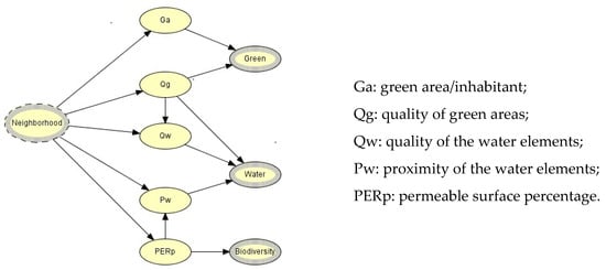 Figure 3 describes the network related to the Natural Elements domain analysis of the Water, Green and Biodiversity nodes. Some inter-parameter links occur in this domain as well. The quality of green areas (Qg) affects the quality of the water elements (Qw), and the percentage of permeable surfaces (PERp) affects the proximity of the water elements (Pw). In both cases, this evidence is explicable on a clear conceptual basis, hence, they have been included in the model.