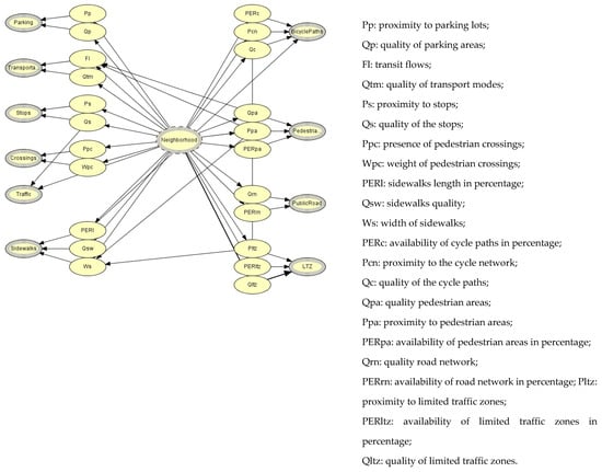 A number of dependencies among urban features, having a plausible ground in theory, have been strongly suggested by the recorded data, and therefore added to this network. These include, the relation between the length of the sidewalks (PERl) and the presence of cycling paths (PERc), the relation between the proximity of the pedestrian areas (Ppa) and the width of sidewalks (Ws), the relation between the proximity of the LTZ (P and the proximity to parking lots (Pp), the relations among the proximity (Ppa) and the quality (Qpa) of the pedestrian areas with the flow of public transport means (Fl).