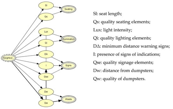 Figure 5 represents the network of the Urban Furniture domain analysis. Dependency relations among features concern the luminous flux (Lux) and therefore the brightness of an urban space, which influences the quality and affects, therefore, the readability of information signs (Qse). In fact, the quality of these elements is measured by analysing their visibility and maintenance status.