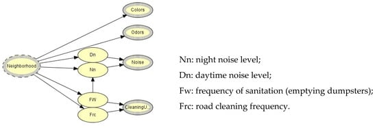 Finally, in the network representing the Perceived Environment domain analysis (Figure 6), the road cleaning (Frc) and emptying waste containers (FW) conceivably influence night noise levels (Nn).