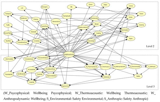Following the layered model structure, the analysis is arranged by levels. According to the HEI approach, level 1 network analysis provides an overview of the general urban ergonomic indicators for each neighborhood and a quantitative assessment of the indicators’ scores to highlight drivers and barriers for walkability. Level 2 and 3 network analysis provides an integrated and more systemic evaluation of ergonomics according to the emerged Bayesian Network structure.