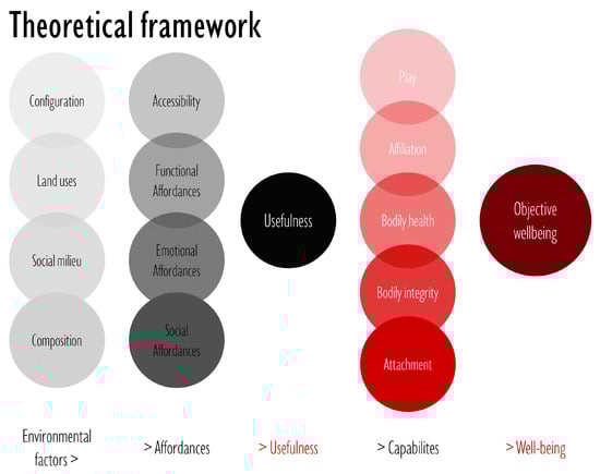 These concepts constitute the theoretical model encompassing a methodology for the assessment of the usefulness of the public space. Within this model, the meaningful usefulness of a setting is determined by the accessibility conditions and by environmental features and amenities [9] that, in relation with children’s characteristics, produce functional, social, and emotional affordances. The meaningful usefulness of public spaces, in turn, affects children’s well-being by encompassing the external conditions shaping their central capabilities [55]. In particular, the opportunities for children’s engagement with the built environment are related to bodily health, bodily integrity, or the ability to move freely from place to place, sense, imagination and thought, emotion, herein defined as the ability to develop attachment to things and people, affiliation, play, and control over one’s environment (see Figure 1) [11,52,54,55,66].