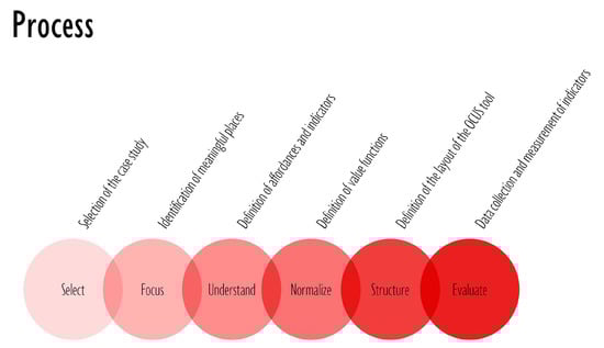 The Opportunities for Children in Urban Spaces (OCUS) tool is envisioned as an audit tool that integrates quantitative and qualitative indicators for measuring the conditions of access to open public spaces and the availability, quality, and variety of functional, emotional, and social affordances, that are determined by the conditions of the built environment at different scales (see Table 1). The OCUS tool combines the analysis of primary data collected during on-site explorations, as well as secondary data collected from territorial informative systems (Sardinia Regional Informative Territorial Service, Open Street Map) and from Internet-based street level imagery services (Google Street View) and territorial imagery services (Google Maps, Google Earth, Bing Maps). The audit tool incorporates a methodological framework organized on six stages (see Figure 2).