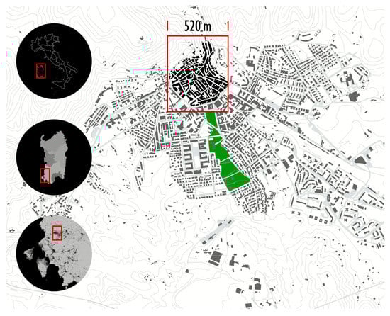 The proposed methodology was applied to the assessment of meaningful urban spaces within the historic district of the city of Iglesias in Sardinia (Italy) (Figure 3). The city of Iglesias was selected as a case study for its particular demographic and socio-economic conditions, including the modest percentage of residents aged between 11 and 14 years, depopulation, and stagnant economy. In fact, regarding the first issue, children aged between 11 and 14 years represent the 2.8% of the population compared to a national average of 3.7%, a regional average of 3.3% and to a value for the city of Cagliari of 2.8% [77].