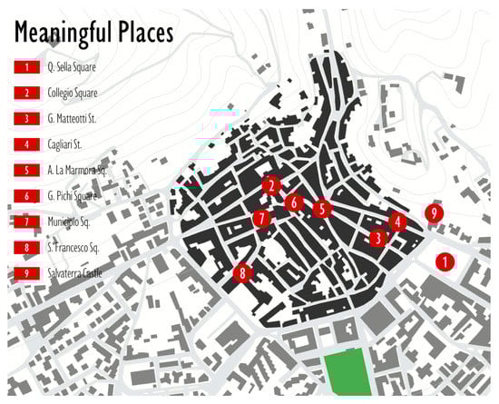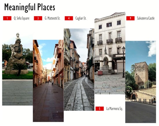 Within this area, nine public spaces are selected as units of analysis according to their relevance as places. A place is herein defined as a portion of space where meaningful representation of, and emotional connection to, settings and people are formed [51]. Consequently, in the first stage of the workshop, children were presented with a map of the city of Iglesias and asked to locate meaningful places in terms of actualized affordances. Then, once the set of meaningful places was established, five itineraries of sensory exploration were defined. Each itinerary investigated a specific theme related to a specific functional, symbolic, or behavioral value attributed by children to the public space. The five themes were: (i) food, (ii) meeting places, (iii) transitory spaces, (iv) space of memory, and (v) boundary spaces. Spaces incorporating different functional, symbolic or behavioral values were then selected and analyzed via the OCUS tool. This set of spaces thus includes Quintino Sella Square, Giacomo Matteotti street, Cagliari street, Lamarmora Square, Pichi Square, Municipio Square, Collegio Square, and San Francesco Square (Figure 4 and Figure 5).