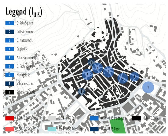 Distribution of values of the IUIS Index across the meaningful places within the historic district of the City of Iglesias, Sardinia, Italy.