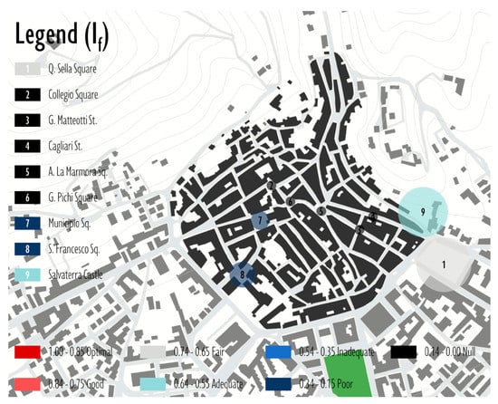 Distribution of values of the If Index across the meaningful places within the historic district of the City of Iglesias, Sardinia, Italy.