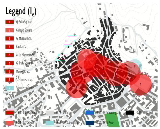 Distribution of values of the Ie Index across the meaningful places within the historic district of the City of Iglesias, Sardinia, Italy.