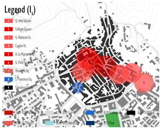 Distribution of values of the Is Index across the meaningful places within the historic district of the City of Iglesias, Sardinia, Italy.