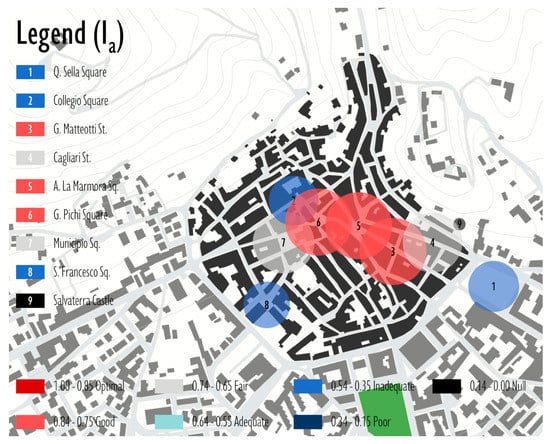 Distribution of values of the Ia Index across the meaningful places within the historic district of the City of Iglesias, Sardinia, Italy.