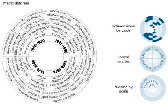 Formal matrix—representation of the data in a diagram that will later enable categorization. The formal matrix, derived from the analysis of historical periods, is the tool used to define the characteristics of school structures and to outline the aspects that distinguish them in the relationship between architecture and educational methodology (Figure 2).