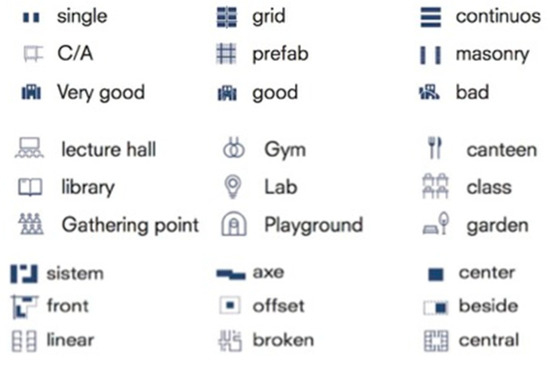 Research in the U.S. by Nair, P., Fielding, R., and Lackney, J., which identified as many as 29 patterns for the project of new school buildings, was taken as a reference for its vast organization and detail in the individual elements that were identified to achieve the design of a healthy and functional learning environment [58]. Starting from the American research, we tried to determine for each individual building a degree of belonging to System, Connective Tissue, and Element, as well as their relative scales. The qualitative characteristics of the elements are related to the temporal categories by identifying formal and technical characteristics of the individual buildings (Figure 1) through the following three factors: