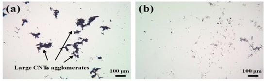 CNT suspensions at the UE of (a) 25 J/mL and (b) 400 J/mL at 200·magnification [].