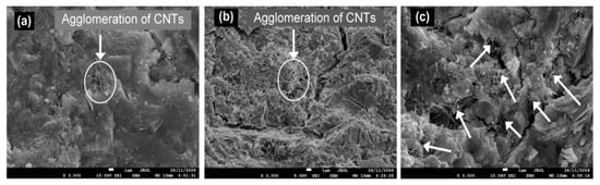 SEM images of CNT–OPC hardened paste samples. Effect of admixtures on the dispersion of CNTs: (a) No Admixture; (b) Air Entrainer; and (c) Polycarboxylate [].