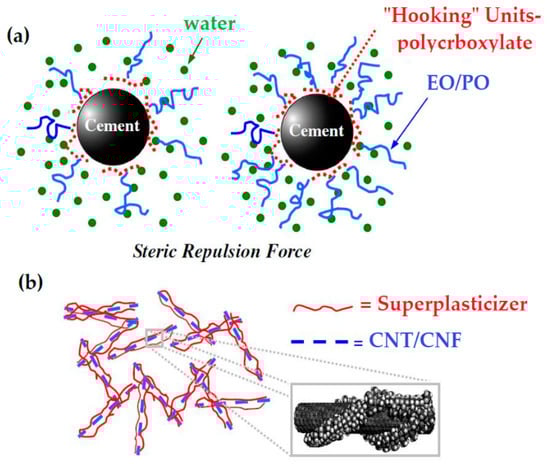 Vesmawala et al. [] also noted the importance of polycarboxylate to disperse CNTs uniformly within a cement-based composite structure. Besides, polycarboxylate-based superplasticizers have a double-dispersion capacity to disperse cement and CNT particles []. The improvement of dispersion by polycarboxylate is attributed to the strong static hindrance effect which pushes the cement particles apart. Polycarboxylate superplasticizer mainly consists of a hydrophobic main chain and hydrophilic pendant groups with a comb molecular structure (Figure 4b). This can easily warp the surface of CNT via hydrophobic and other intermolecular interactions, while the hydrophilic part helps to disperse and prevent agglomeration in the aqueous solution through static stabilization. Xu, Shilang et al. [] reported that uniformly distributed CNTs provide sites for the growth of hydration products, while agglomerated CNTs create weak zones and lead to the formation of pores. The study also showed that CNTs were well dispersed and were connected to hydration products.