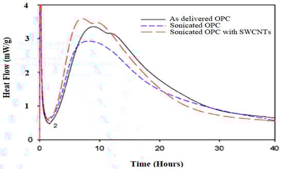 Cui, Hongzhi et al. [] investigated the influence of CNTs (0 to 1% CNT) on the heat of hydration of cement paste containing Microencapsulated Phase-Change Material. The study results reported that the incorporation of CNTs in the cement matrix did not influence the heat of hydration for the first 3 h, while at 12 h the cement matrix containing 1% CNT showed the highest hydration rate. It was also observed that the presence of CNT accelerated the cement hydration reaction and shortened the final setting time.