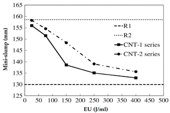 Zou et al. [] showed the importance of ultrasonication energy on the properties of composites containing CNTs. A mini slum test was carried at different ultrasonic energies to determine the flow of the sample containing a constant amount of superplasticizer. Figure 6 shows that the composite sample achieved a lower slump at a higher ultrasonication energy. Composite samples R1 and R2 were prepared with plain OPC with 0.55 wt% and 0.70 wt% p/c, respectively. In the case of the CNT-OPC paste, CNT-1 series and CNT-2 series were prepared with a c/c of 0.038 wt% and 0.075 wt%, respectively. The explanation is that at a higher ultrasonication energy the dispersion of CNT is more effective, and CNT bundles leave more surface area available for the superplasticizer to absorb onto it, and thus less free superplasticizer is left to control the rheology of the composite sample.
