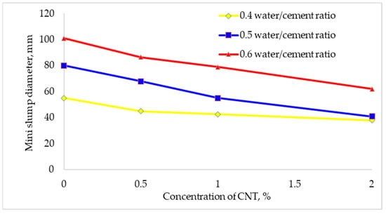 Kim et al. [] scrutinize the influence of CNT/cement mortar at different loadings of carbon nanotubes, from 0.1% to 0.5%, at different water/binder ratios. At 0.4% water-binder ratio, the composite sample achieved 240 mm flowability at 0.1% loading of CNTs, which reduced to 104 mm at 0.5% CNT concentration. Ha, Sung-Jin et al. and Collins et al. [,] also reported the decrease in flowability with the increasing concentration of CNTs.
