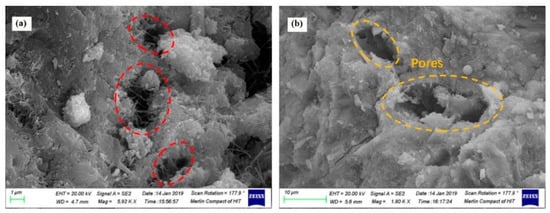 Collins, Frank et al. [] showed that a polycarboxylate superplasticizer worked positively and improved the dispersion of CNTs within the ordinary Portland-cement-based composite (OPC). A composite with air entrainer and a plain composite without any admixture showed the agglomeration of CNTs within the composite structure (Figure 3).