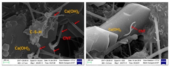 Carbon nanotubes can act as a nucleating agent [,] for calcium silicate hydrate (C-S-H) and enhance the mechanical properties of cementitious composites (Figure 9). CNTs introduced into cement-based composites create sites for the hydration process and lead to a stronger and denser microstructure. CNTs were found to coat the calcium silicate hydrate (C-S-H) and provide a larger contact area between themselves and the hydration product. As a result, stronger bonds were created between them which significantly help to improve the mechanical properties of cementitious composites []. Moreover, CNTs improve the load transfer efficiency of the cementitious composites by their pulling out behavior and crack bridging effects [,]. Figure 10 represents the crack bridging and pulling out behavior of CNTs. It can be clearly observed that one end of a pulled out CNT stands freely, while the others remain connected with the nanopores of the composites. Literature studies indicate that the mechanical properties of CNTs incorporated in cementitious composites can be influenced by various parameters, such as water/cement or water/binder ratio, CNT properties, utilized surfactant, CNT concentration, volume of binding materials, types of fine fillers (fly ash, silica fume), acid treatment of CNTs and the proper dispersion of CNTs into the cement composites.