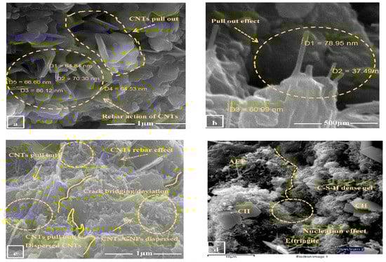 (a,b) Rebar and pull out effect of CNTs, (c) crack deviation and pull out of CNTs, (d) crack discontinuity and the presence of dense calcium silicate gel with AFT [].