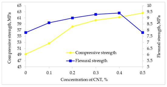 The concentration of CNTs is one of the determining factors of the mechanical performance of CNTs incorporated in cementitious composites. The compressive and flexural strength of composites increased until a certain concentration was reached, and once the optimum concentration was exceeded, it started decreasing. The influence of CNTs was observed to be different for the type of cement composites. These phenomena were observed for CNTs incorporated in cement paste, mortar and concrete, as shown in Figure 11, Figure 12 and Figure 13. Guan et al. [] reported that the maximum improvement in the compressive strength of CNTs incorporated in cement paste was identified at 0.1 wt% of CNTs by weight of cement, while at 0.5 wt% CNTs loading the maximum improvement were noticed for the flexural strength of cement paste. Zhan et al. [] evaluated the performance of cementitious mortar under different loadings of CNTs and reported that the maximum flexural strength and compressive strength were achieved at 0.8 wt% and 1.2 wt% CNT loadings (Figure 12). Similarly, Vesmawala et al. [] investigated the influences of the concentration of CNTs on the mechanical properties of concrete. The study results show that the flexural strength of concrete increased until 0.4 wt% of CNTs and then started decreasing. While the compressive strength of the concrete was increasing along with the increased concentration of CNTs, at 0.5% maximum loading of CNTs the compressive strength was measured (Figure 13) and found to be 27.35% higher compared to plain concrete. The reduction in compressive strength at a higher concentration of CNTs can be explained by the fact that agglomerations of CNTs within the hardened structure raise the local stress and thus weaken the strength.