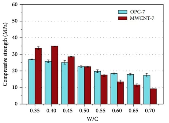Collins et al. [] evaluated the influences of the water-cement ratio on the mechanical properties of cement paste containing different CNT concentrations. Study results reported that by increasing the water-cement ratio the strength properties decreased. The composite sample at 0.5 wt% loading of CNTs achieved a compressive strength of around 25 MPa at 0.4 water/cement ratio. The compressive strength decreased to around 21.25 MPa and 12.5 MPa at 0.5 and 0.6 water/cement ratios, respectively. This was compared to a 0.4 water/cement ratio of almost 14% and a 50% reduction in strength for 0.5 and 0.6 water/cement ratio composites at the same CNT doses. Similarly, the decrease in strength at a higher water/binder ratio was observed by Kim et al. []. At 0.1% CNT loading and 0.6 water/binder ratio an almost 32.5% decrease in compressive strength was noticed for cement mortar over the composite prepared at 0.4 water/binder ratio. Choi et al. [] reported a decrease in compressive strength at a higher water/cement ratio (Figure 14). The decrease in strength at a higher water-cement ratio can be explained by the fact that after the evaporation of water concrete becomes a more porous structure, which leads to a decrease in strength. Besides, a higher water-cement ratio delays the hydration process and produces lower heat during the hydration process, which leads to lower strength properties.