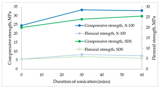 Du et al. [] summarized the findings of the literature studies and concluded that ultrasonication not only helps to separate the aggregated CNTs but also improve the mechanical properties of CNT-cement-based composites. Similarly, Alrekabi et al. [] and Zou et al. [] stated the importance of ultrasonic energy for improving the mechanical properties of CNTs incorporated in cement-based composites. An optimum level of ultrasonication can disperse the CNTs monogamously and provide maximum mechanical performance, while improper sonication leads to the agglomeration of CNT within the composite structure and decrease the positive effects of CNTs. It was suggested that up to 31.54% flexural strength could be enhanced by incorporating ultrasonic energy, which decreases the porosity and increases the crack-bridging capacity of the cement-based composite at the nanoscale []. Besides, Alrekabi et al. [] stated that the duration and sonication intensity also significantly influence the mechanical properties of CNT-cement-based composites. A composite sample with a dispersed superplasticizer at moderate sonication intensity showed the maximum mechanical performance at 10 min of sonication of the samples containing 0.025 wt% and 0.05 wt% CNTs. Meanwhile, it took longer to reach the maximum level of dispersion and mechanical performance for the low CNT (0.01%) composite sample. Similarly, composite samples at high sonication intensity achieved the maximum level of mechanical performance at a very low time (at 3 min for 0.025 wt% and 0.05 wt% CNTs), while the 0.01 wt% composite achieved the maximum level of mechanical performance at 5-min sonication. Excess sonication energy can cut CNTs into smaller fragments and influence the mechanical performance. However, the degree of dispersion and mechanical performance also depends on the used surfactant and its compatibility with cementitious materials. ElKashef et al. [] reported that CNTs dispersed with Sodium Dodecyl Sulfate (SDS) and Triton X-100 (X-100) (non-ionic surfactant) showed the maximum level of mechanical performance at 30 min of sonication (Figure 15), and thereafter it started decreasing. So, it can be concluded that sonication duration and sonication energy are both influencing factors. A well-designed sonication can provide a maximum level of positive effects of CNTs. Moreover, moderate sonication energy was observed to disperse and provide the maximum mechanical performance.