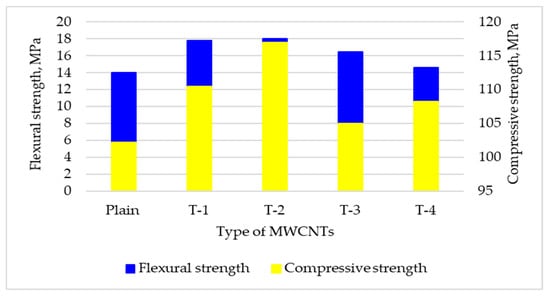 Compressive and flexural strength of cement-based composite containing 0.25% CNTs by weigh of cement at 28 days water curing hydration. (T-1, CNT: 0.5–2 μm length, <8 OD/nm, −3.86% COOH; T-2, CNT: 0.5–2 μm length, <8 OD/nm, 5.58%-OH; T-3, CNT: 3–10 μm length, 100–200 OD/nm; T-4, CNT: 10–30 μm length, 20–30 OD/nm [].