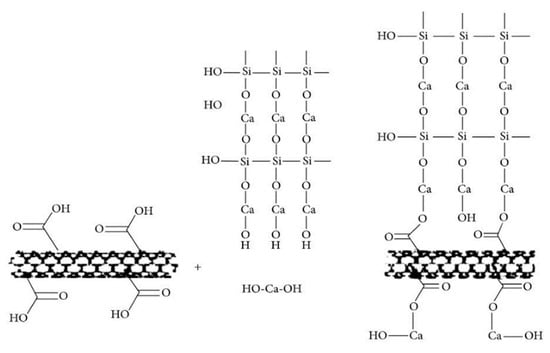 Reaction scheme between the carboxylated nanotube and hydrated production of Ca(OH)2 and C–S–H of cement [].