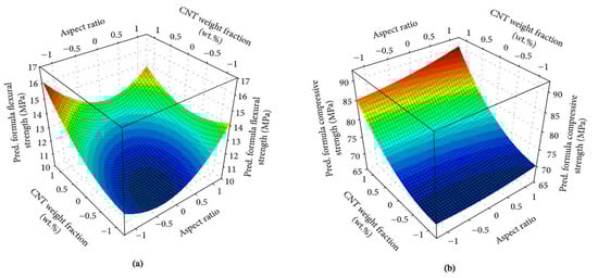 Response Surface Methodologies (RSM) model of strength factor against the weight fraction and aspect ratio of CNTs. (a) flexural strength, (b) compressive strength [].