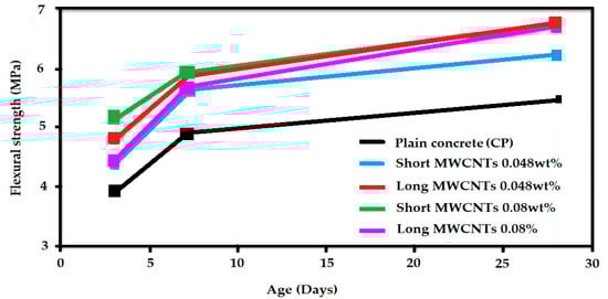The geometry of CNTs is also considered to be an influential factor in terms of dispersion and mechanical performance. Mohsen et al. [] reported that a cementitious composite containing CNTs with the lowest diameter and a high aspect ratio achieved higher mechanical strength when compared to CNTs with a medium or larger diameter (Figure 18). Besides, a cementitious composite containing longer CNTs achieved a slightly higher flexural strength. Similar phenomena were noticed by Manzur et al. []. The composite sample containing CNTs with the smallest outer diameter achieved the highest compressive strength. This can be explained by the fact that smaller CNTs were dispersed in a much finer scale and filled the nanopores of the cement composite more efficiently [,]. Liew et al. [] reported that a lower amount of long CNTs provides a more effective reinforcement, and to achieve the same level of reinforcement a bigger amount of short CNTs was required (Figure 19). Study results clearly indicate that long CNTs were found to be more effective for the enhancement of flexural strength.