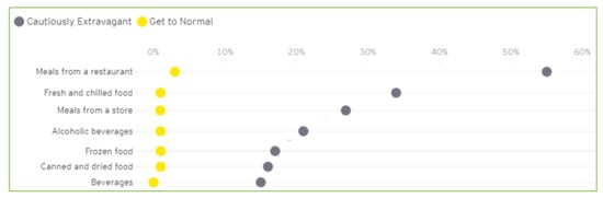 According to the EY Future Consumer Index by Rogers and Cosgrove [], of the five consumer segments to assume importance when the COVID-19 crisis can be said to have passed, 28% of cautiously extravagant consumers (25% of the 4859 consumers surveyed in the USA, Canada, the United Kingdom, France, and Germany during the week starting 6 April 2020) will change their eating habits as a result of COVID-19 whilst only 14% of get to normal consumers (31%) envisage that their eating habits would change. Specifically, the former group envisaged increasing their expenditure (by between +15–55%), especially on restaurant food and to a lesser extent fresh food, ready meals, alcoholic beverages, frozen food, canned and dried food, and beverages (Figure 1). By contrast, the latter group did not envisage increasing their expenditure of food shopping (between +1–3%).