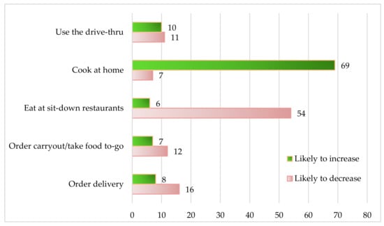 A study by Datassential [] of 1000 consumers in the United States that was conducted on 10 March 2020 revealed that 69% of people preferred to cook at home and 54% did not prefer to eat at sit-down restaurants (Figure 2). Moreover, according to a quantitative survey conducted online on 2 April 2020, many Americans spent much time engaging in household activities, such as cooking and baking []. Greater confidence and families taking pleasure in cooking together, with higher expectations of cooking more after the pandemic to save money and enjoy a healthier diet, were also reported [].