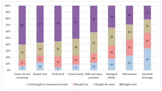 According to Li et al. [], vegetables, rice, and meat in China were in greatest demand during the early stages of the pandemic; China imposed a mandatory, nationwide quarantine between 23 January and 9 February 2020. Moreover, the results of a survey conducted online on 14–16 February 2020 in China by Ipsos [] revealed that the purchase of foods such as grains, instant food, fresh food, snacks, and dairy products increased significantly during the pandemic; pre-packed beverages, fruit juices, and vitamin drinks increased slightly in the same period; while alcoholic beverages declined (Figure 3).
