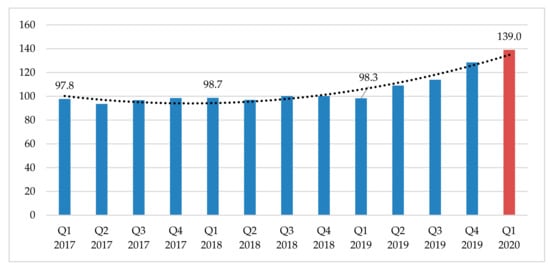 Price is one of the factors affecting consumer behaviour and purchasing habits, particularly during times of a pandemic and lockdown [,]. The above-mentioned kinks in the supply chain have affected the global food system [,] by impacting on the prices of agricultural products. For example, this impact has been highlighted by fluctuations in the agricultural Producer Price Index (PPI) in China between the first quarters in 2017 (2017 Q1) and 2020 (Q1 2020) (Figure 4). The price index for the first three months of 2020 (139.0) was higher compared with the same quarter in 2017–2019 (98.3 on annual average) [].