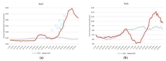 Wholesale price trend of beef (a) and pork (b) in the USA. Source: Lusk [].